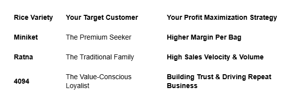 Your Profit Strategy: Profit Through Volume. While the margin per bag might be more standard, Ratna is a high-velocity product. It's a consistent, repeat purchase that drives reliable, steady revenue and ensures healthy cash flow for your business.